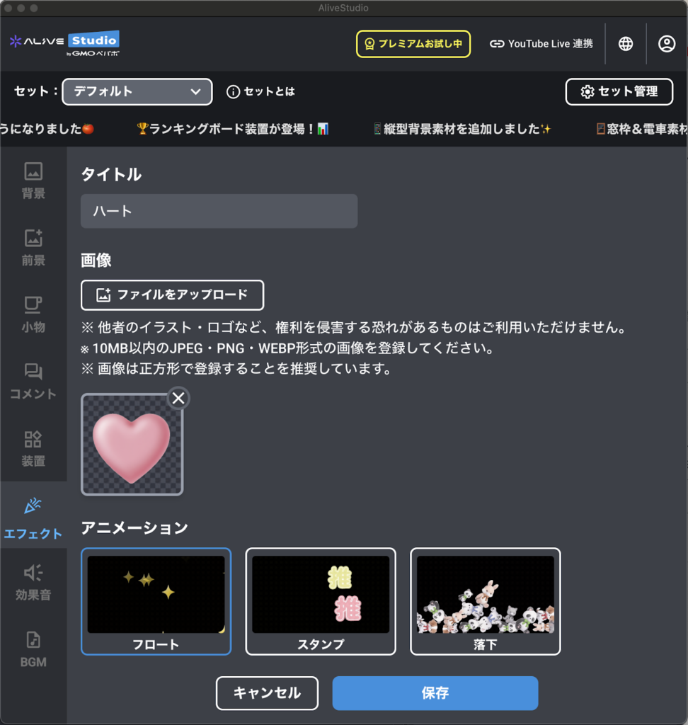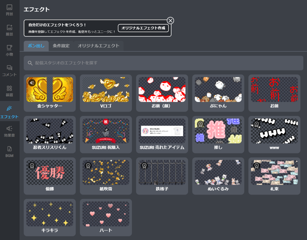 Alive Studioのフリープランでは、配信演出の基本となる機能を無料で利用でき、エフェクトのポン出し機能も一部無料で利用が可能です。