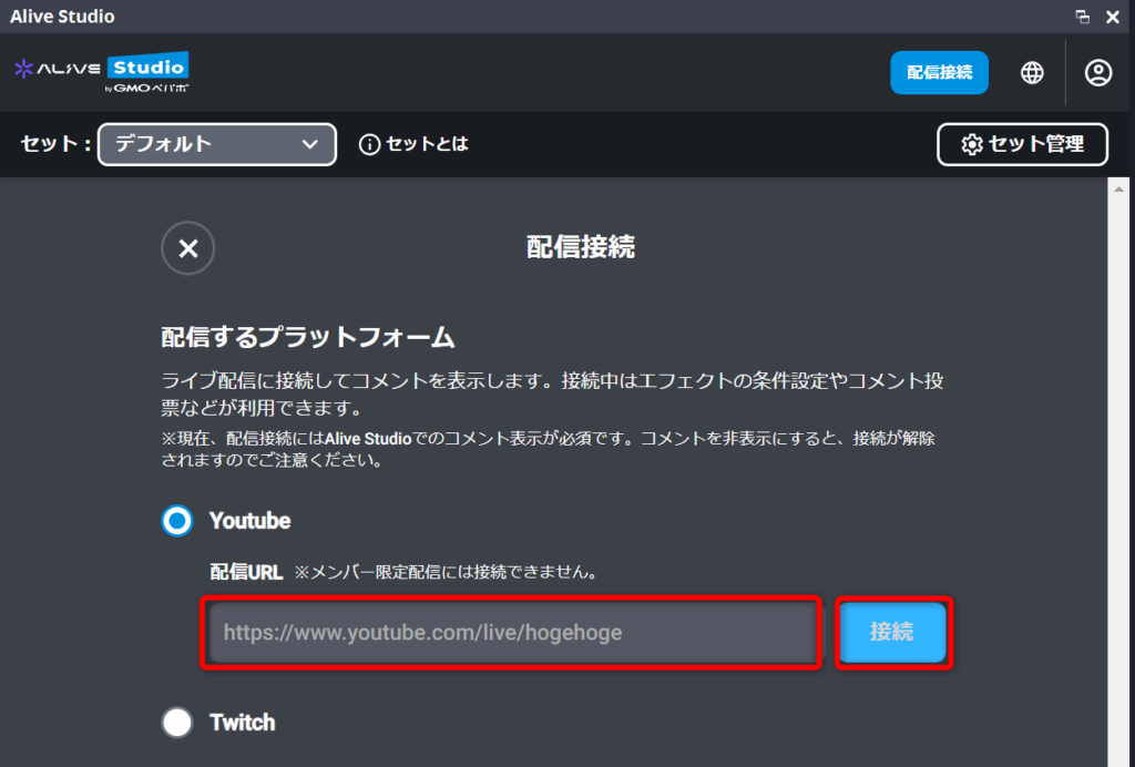 配信URLをコピーして貼り付けを行い、「接続」をクリック