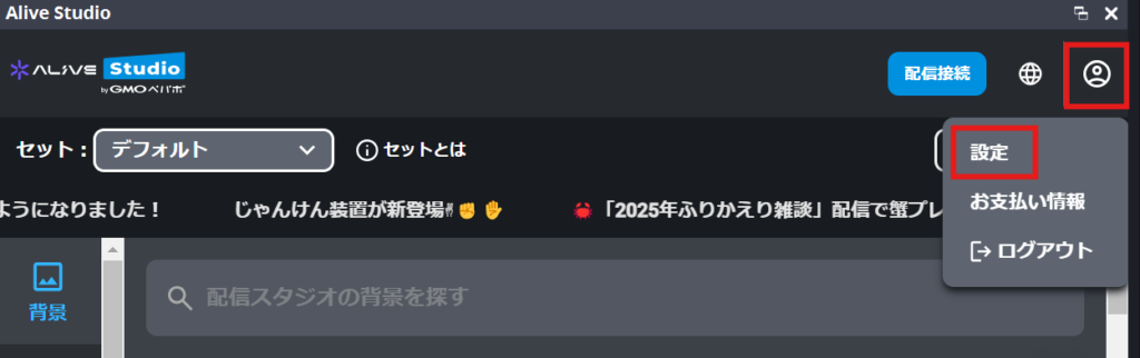 1.Alive Studio右上の人マークのアイコンから「設定」をクリック