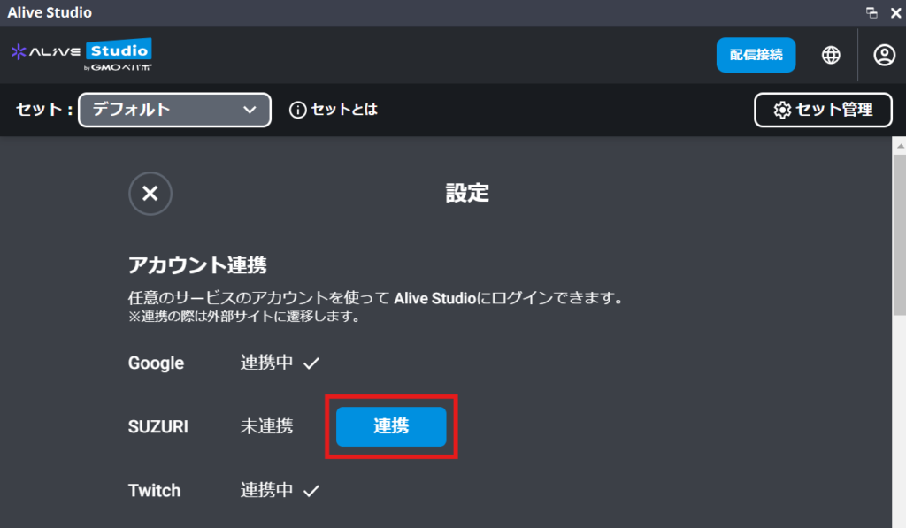 ※Twitch連携が初めての場合やTwitchアカウントでAlive Studioを登録していない場合は、最初にTwitchでログイン情報の入力が必要です。画面に従ってログインを行ってください。