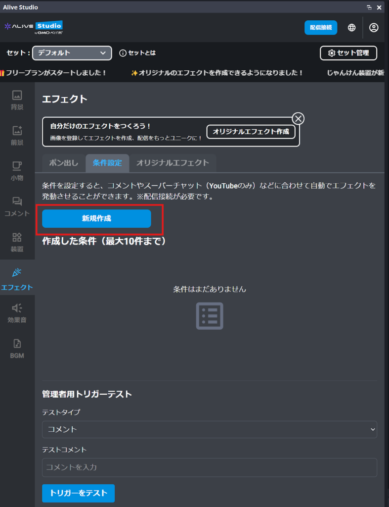 慣れてきたら、条件設定エフェクトやオリジナルエフェクトを取り入れて、あなたの配信らしい“盛り上げ方”を少しずつ作っていきましょう。