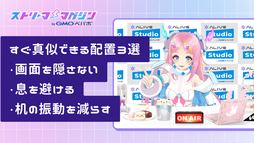 ここからは、形で真似できる配置テンプレを3つ紹介します。どれも、配信でつまずきやすいポイントを先回りしてある程度対処できるような型です。まずは自分のデスクで一番やりやすいものから試してみてください。