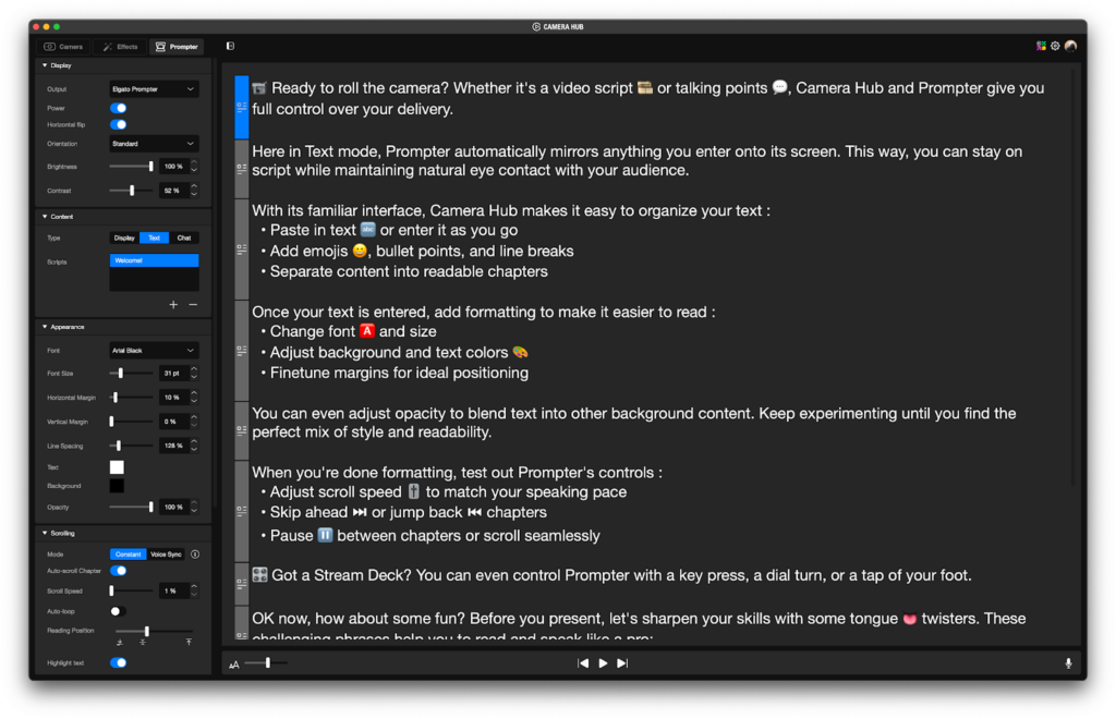 長い台本は「オープニング」「本編」「エンディング」のようにチャプター分けできます。Stream Deckと組み合わせれば、ボタン一つで好きな章にジャンプ可能です。