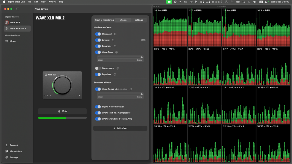Wave XLR MK.2/XLR Dock MK.2は機材内チップが音声処理を肩代わりしてくれるため、配信者目線で見ると、「PCのスペックや負荷を気にしすぎず、安定した音を出しやすい」のが大きなメリットです。