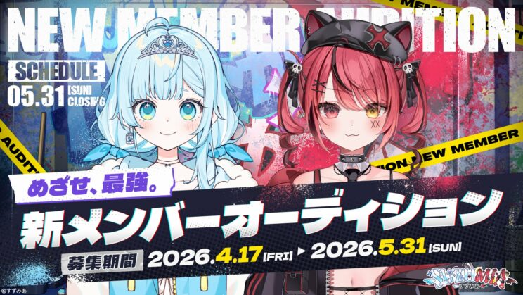 株式会社Brave groupは、VTuberユニット「すずみあ」の新メンバーオーディションの受付を4月17日(金)より開始したことを発表しました。「ファンと共に作り上げる最強のVTuber」をテーマに、七乃羽すず・赤彩みあに続く新たな仲間を募集する本オーディションは、5月31日(日)23:59まで受付予定です。