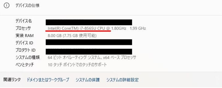 - バージョン情報の「プロセッサ」にIntel(R) Core(TM) 〜と書いてある