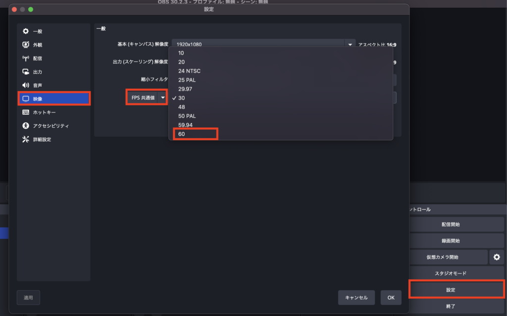 リフレッシュレートが60Hz以上の場合は、60Hzに変更するとOBSの録画映像のカクつきが改善する可能性があります。