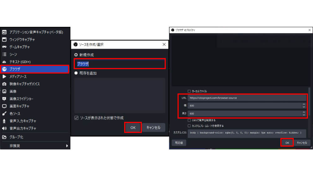 OBSを起動し、画面下部の「ソース」にある「+」ボタンをクリックします。メニューが表示されるので、「ブラウザ」を選択しましょう。