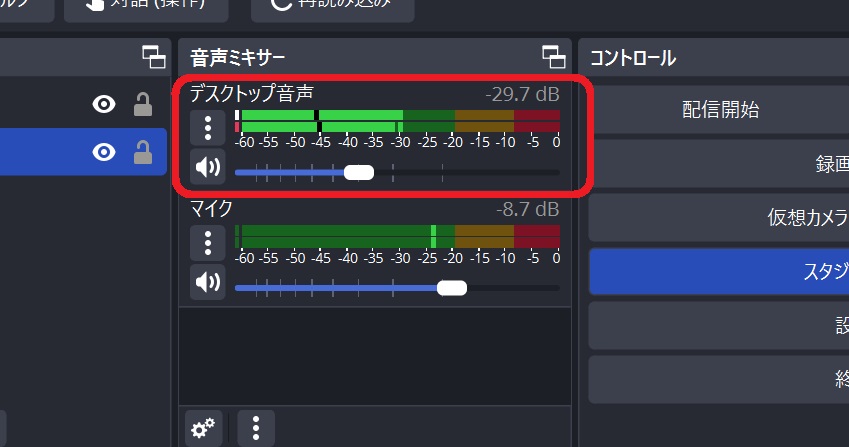 また、YouTubeの動画を配信に利用する場合、音声ミキサーに「デスクトップ音声」が追加されているかを確認しましょう。「マイク音声」では画面上の音声を拾わないため、注意してください。