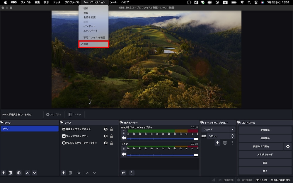 OBSのシーンコレクションとは、OBSでのシーンやソース、音声ミキサーなどの初期設定を指します。OBSのメイン画面の下部にある表示内容を保存することが可能です。