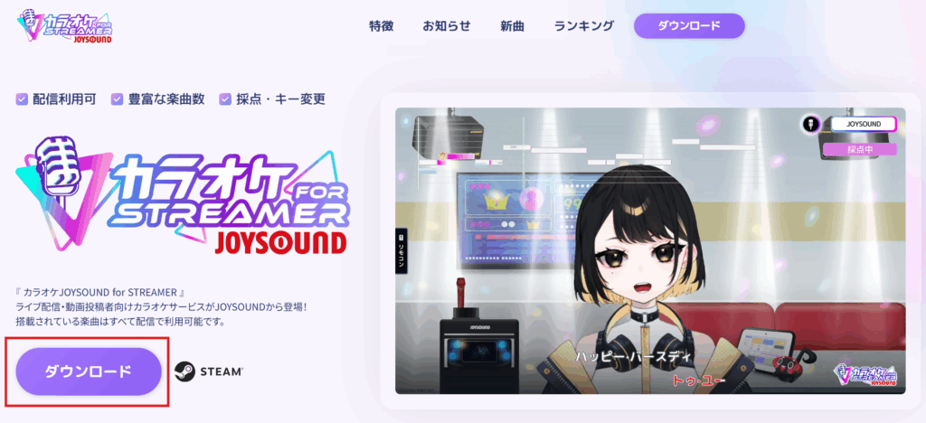 1.「カラオケJOYSOUND for STREAMER」へアクセスし、「ダウンロード」ボタンをクリック