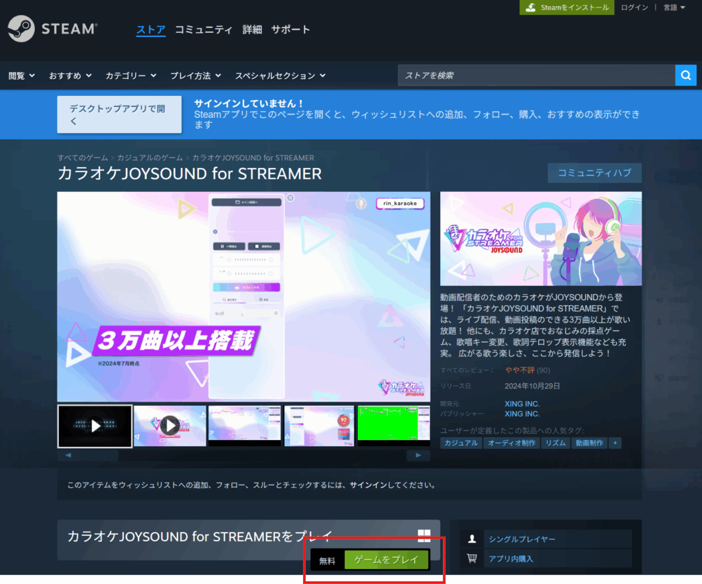 カラオケJOYSOUND for STREAMERは、Steam経由で簡単にインストールが可能です。以下の手順に沿って進めると、すぐに配信の準備が整います。