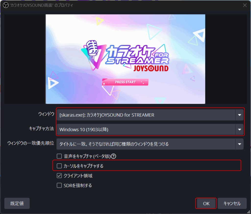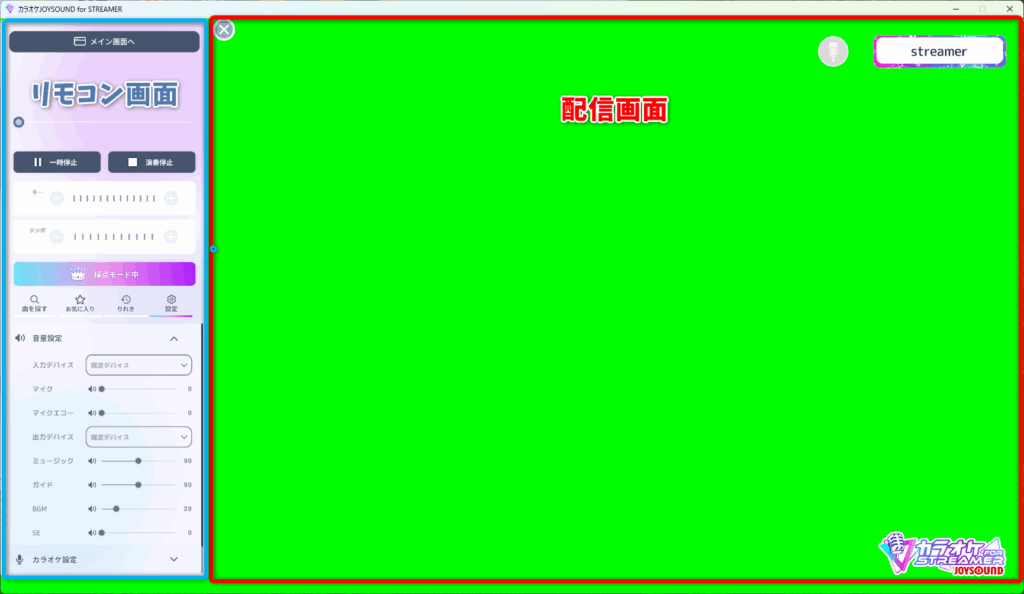 - ウィンドウ:「カラオケJOYSOUND for STREAMER」を選択