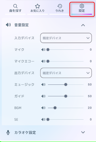 | ミュージック | カラオケ音源の音量 | 50% ※環境に応じて調整 |