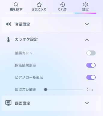 カラオケ設定:「カラオケ設定」のプルダウンを開き、各項目の設定を行います。