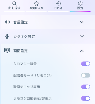 アプリケーション内での設定は「リモコン画面」の「設定」タブから行うことが可能です。それぞれ「音量設定」「カラオケ設定」「画面設定」の配信する際の推奨設定について記載します。