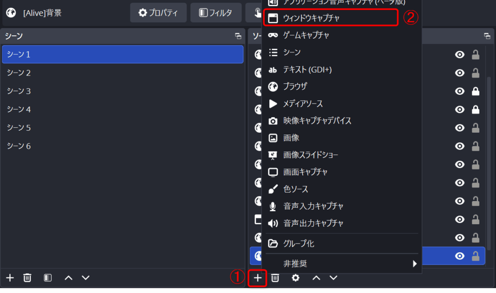 1.OBSのソース一覧から「+」ボタンをクリックして、「ウィンドウキャプチャ」を選択