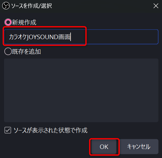 カラオケJOYSOUND for STREAMERの配信用画面は、OBSの「ウィンドウキャプチャ」で取り込むのが最も安定します。ゲームキャプチャでは正常に動作しない場合があるため、必ずウィンドウキャプチャを選択しましょう。