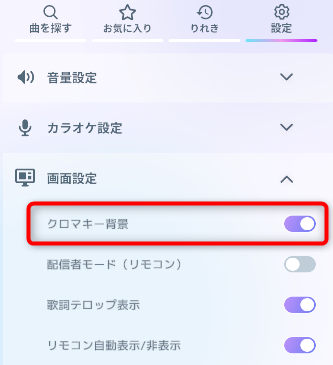 1.カラオケJOYSOUND for STREAMERの画面設定で「クロマキー背景」がONになっていることを確認