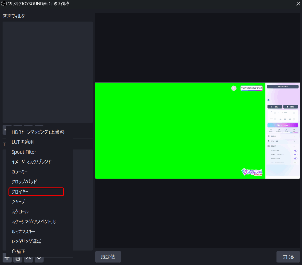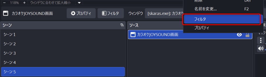 2.OBSでウィンドウキャプチャのソース(例:「カラオケJOYSOUND画面」)を右クリックし、「フィルタ」を選択