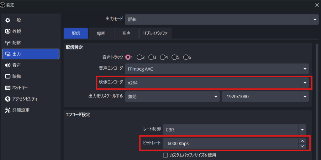 - 「設定」>「出力(出力モード:詳細)」>「配信」の「映像エンコーダ」でNVENC/VCEが利用可能か確認