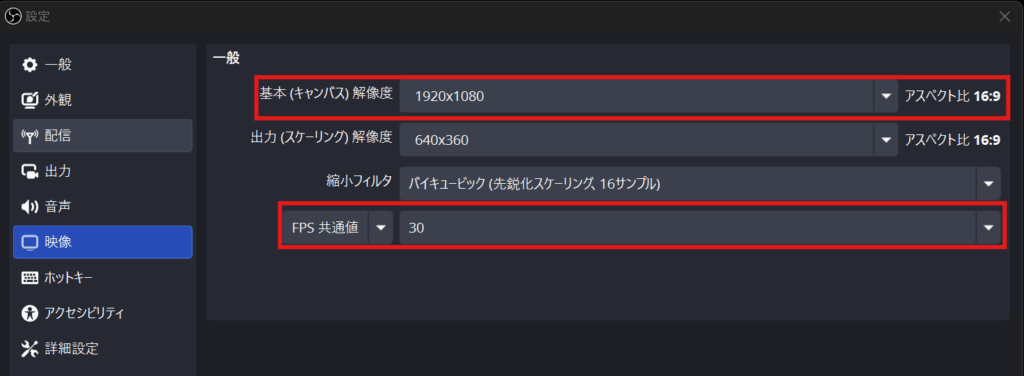 安定した映像配信には、解像度やフレームレート、ビットレートのバランスが重要です。OBSの「設定」を開いて、以下の推奨設定に沿って設定しましょう。