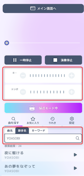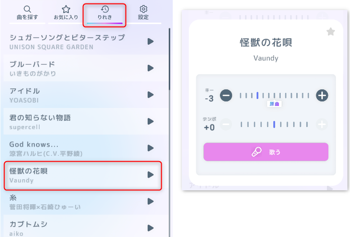 過去に歌った曲のキーやテンポが自動で保存されるため、次回同じ曲を歌うときに設定をやり直す必要がありません。