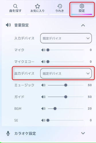 カラオケJOYSOUND for STREAMERの「設定」>「音量設定」の「出力デバイス」が使用しているオーディオインターフェースになっているか確認しましょう。