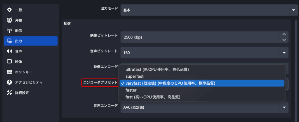 - 映像エンコーダx264使用時は「出力(出力モード:基本)」>「配信」でエンコーダプリセットを「veryfast」以上へ