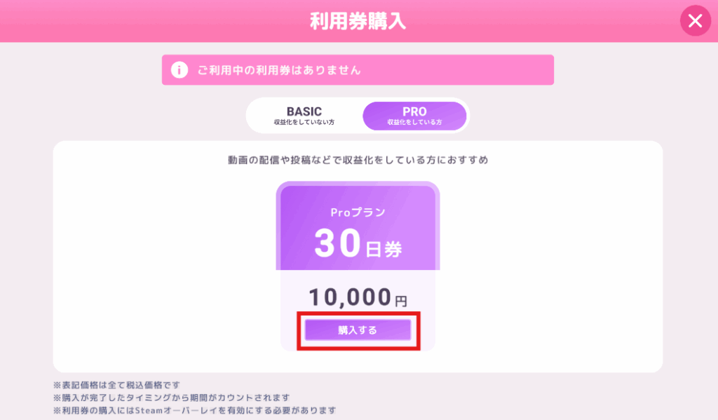 | Proプラン | ¥10,000 | ・Basicプランの全機能 ・動画配信プラットフォームでの収益化が可能 ・豪華なIDプレート |