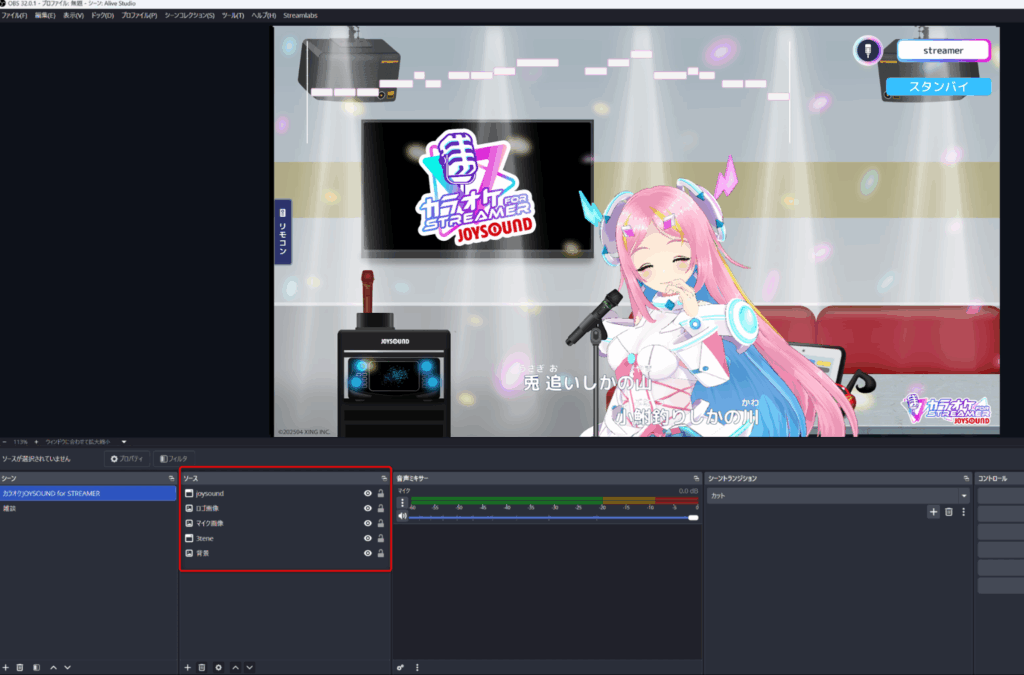- ウィンドウ:「カラオケJOYSOUND for STREAMER」を選択