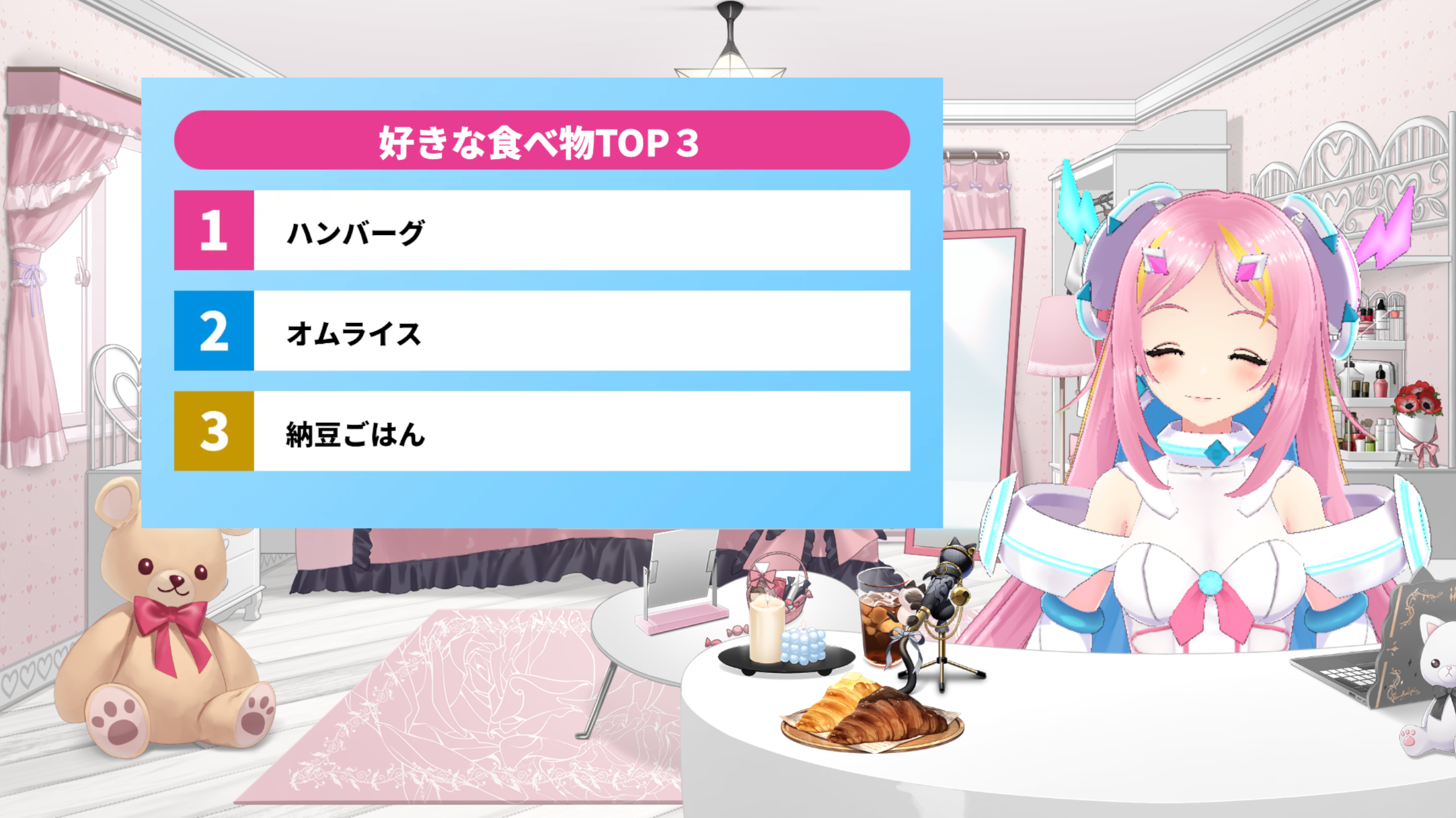 1位〜3位のランキングをバラエティ番組風に華やかに発表! タイトルとランキング内容をカスタマイズでき、ワンクリックで表示・非表示を切り替え。 好きな食べ物ランキング・クイズ・人気キャラ投票など、 企画のアイデア次第で使い方は無限大。 テレビのバラエティ風の演出が手軽にできちゃいます📊