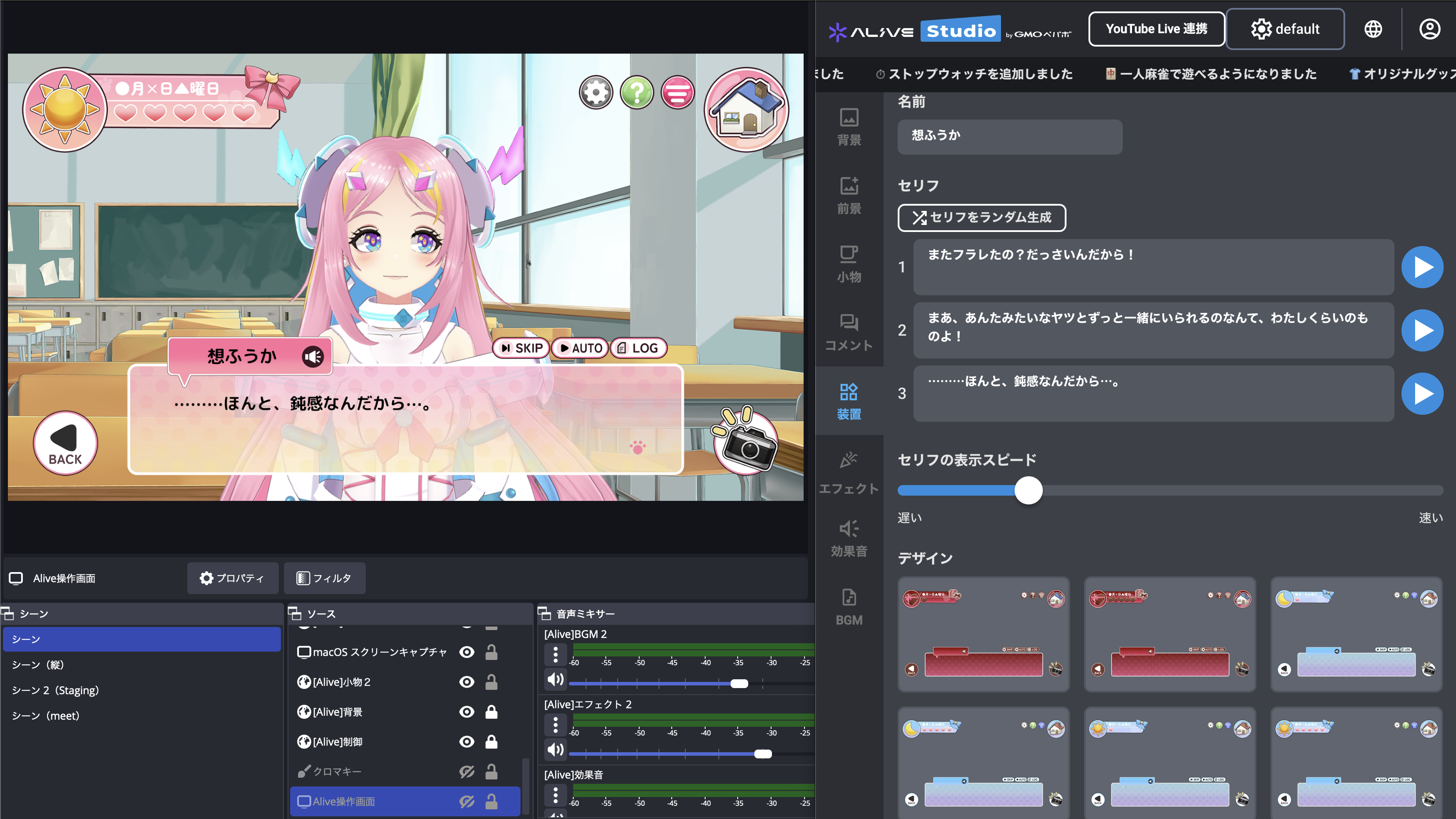 Alive Studio byGMOペパボはOBS上で素材を選ぶだけで、かんたんに配信画面が作成できるサービスです。豊富な画像素材や効果音・BGMのほか、お題ルーレット、時計、テロップなど、配信をもっと盛り上げる機能もたっぷりそろっています🎮あなたの配信を、もっと楽しく、自分らしく演出してみてね!