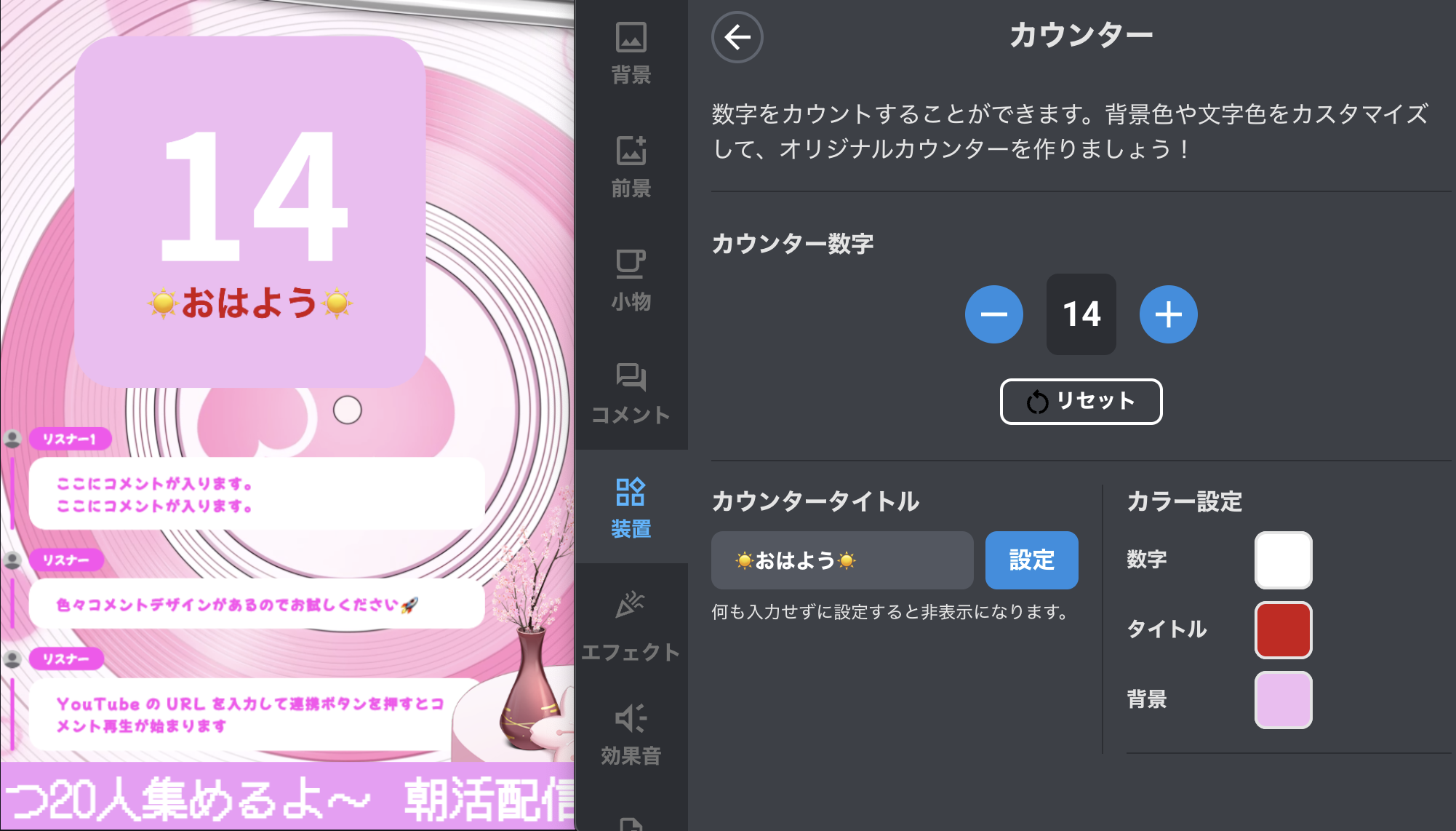 OBSと連携して、 配信画面にカウンターを表示できます。