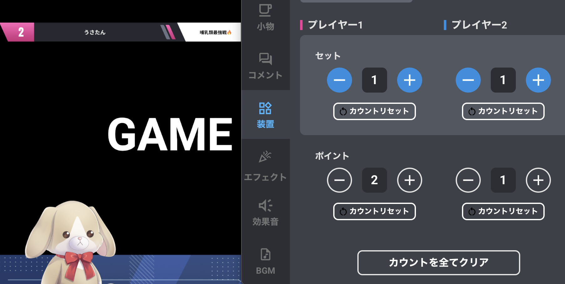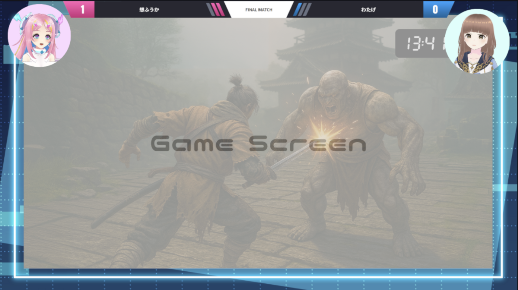 ゲーム配信・大会向けの本格スコアボード! BO3(2本先取)・BO5(3本先取)・カスタムなど、多彩なトーナメント形式に対応。 プレイヤー名・セット数・ポイントをOBS上でリアルタイムに管理できます。 プロ級の対戦画面演出がこれひとつで完成します🏆