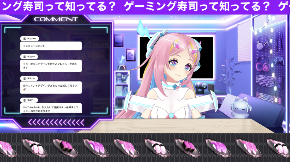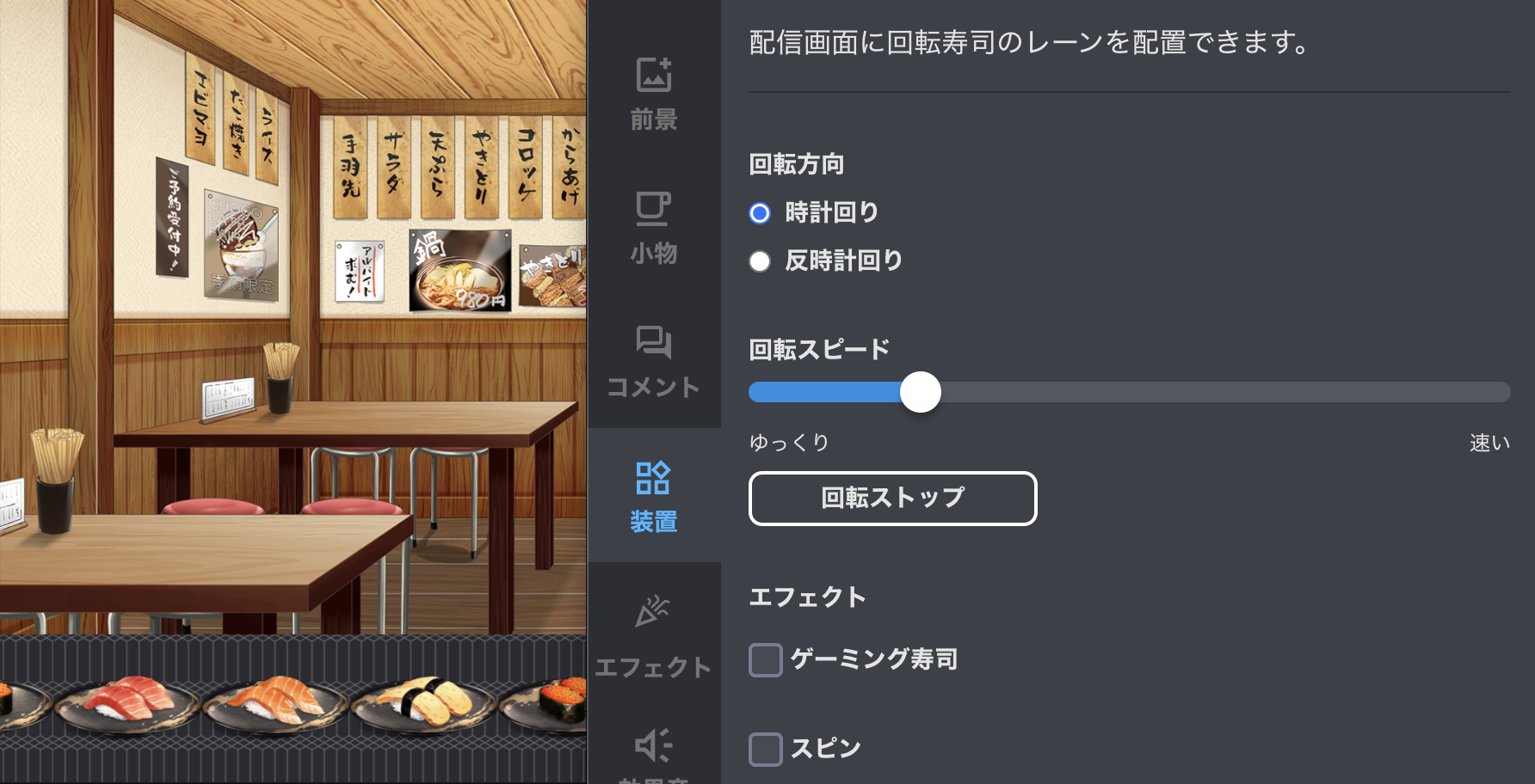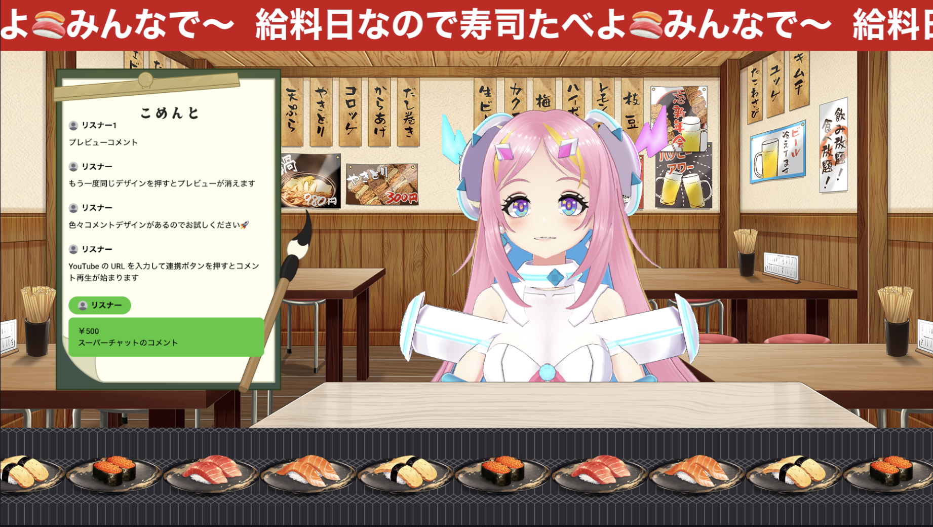 OBSと連携して、 配信画面に回転寿司レーンを表示できます。
