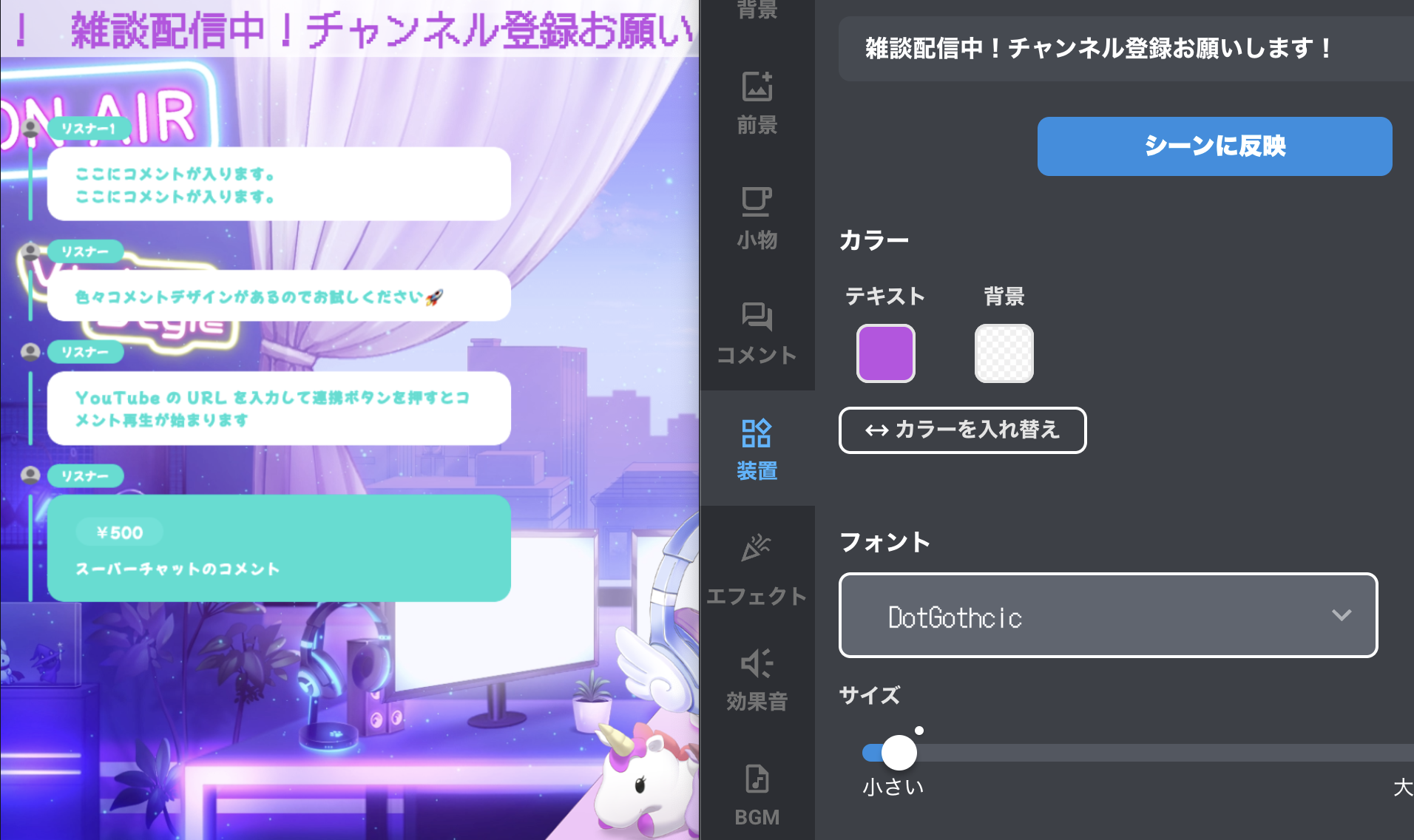ワンクリックで流れるテロップを配信画面に表示できます。 フォント・色・透明度を自由にカスタマイズ可能。 OBS上で配信中にリアルタイムで内容を変更できるので、 急なお知らせやSNSアカウントの告知にもすぐ対応。 伝わりやすい、ワンランク上の配信画面が簡単に作れます✨️