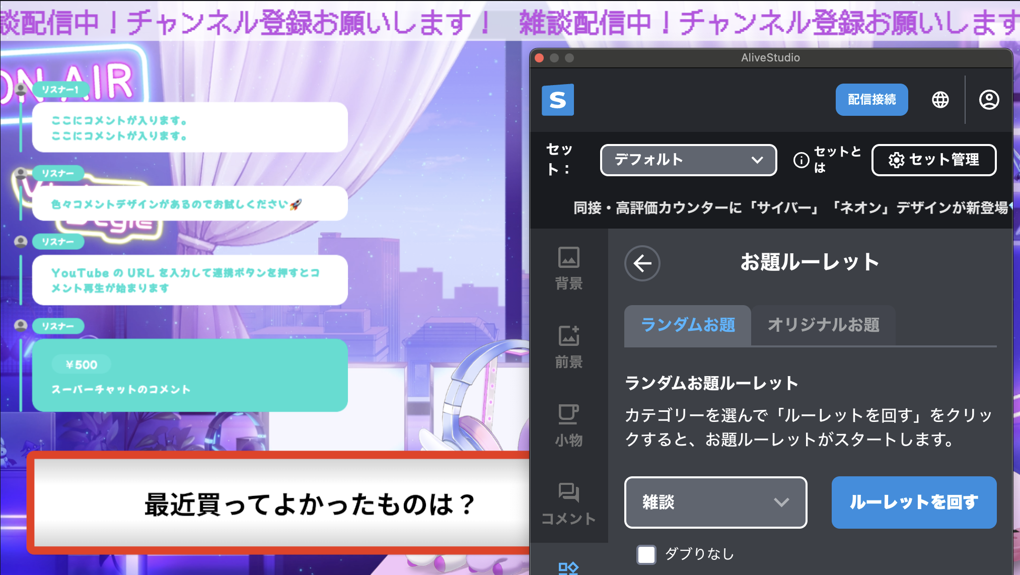 Alive Studio byGMOペパボはOBS上で素材を選ぶだけで、かんたんに配信画面が作成できるサービスです。豊富な画像素材や効果音・BGMのほか、お題ルーレット、時計、テロップなど、配信をもっと盛り上げる機能もたっぷりそろっています🎮あなたの配信を、もっと楽しく、自分らしく演出してみてね!