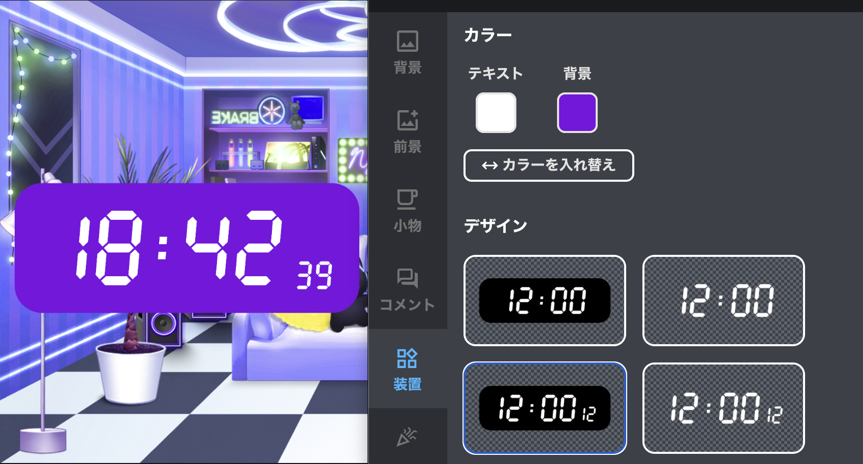 32種類のスタイリッシュなデザインから選べるデジタル時計! CSSなどの技術知識は一切不要で、ワンクリックで配信画面に設置できます。 配信画面の雰囲気に合わせてお好みのデザインを選ぶだけ。 リスナーさんにも時間が伝わるので、タイムスケジュール配信にも便利です。